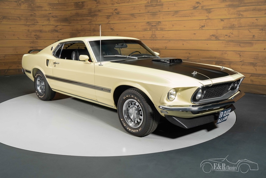 Ford Mustang Fastback Mach 1 428 Cobra Jet met 7.0 liter Cobra Jet motor te koop Qua uiterlijk maakt deze Mustang indruk met zijn crèmekleurige lakwerk en zwarte Mach 1-striping, die prachtig contrasteren met het zwarte kunstlederen interieur. De matzwarte motorkap, de originele velgen met white letter banden, de achterspoiler en louvers maken het plaatje compleet. Binnenin wordt je begroet door klassieke houten inlegpanelen, stoelen met rode accenten en een cockpit die helemaal gericht is op de bestuurder. De harmonie tussen lakwerk en interieur geeft deze Mustang een tijdloze, sportieve uitstraling die je zelden ziet.