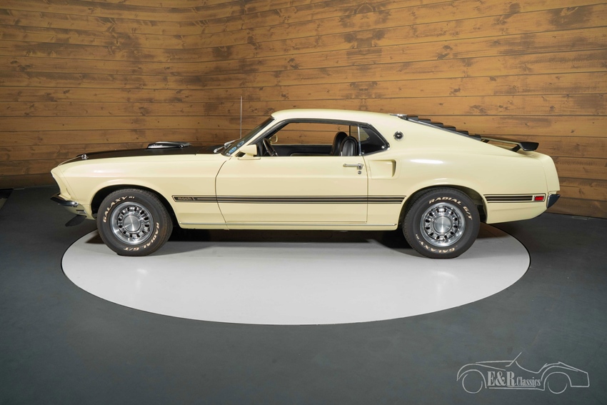 Ford Mustang Fastback Mach 1 428 Cobra Jet met 7.0 liter Cobra Jet motor te koop Qua uiterlijk maakt deze Mustang indruk met zijn crèmekleurige lakwerk en zwarte Mach 1-striping, die prachtig contrasteren met het zwarte kunstlederen interieur. De matzwarte motorkap, de originele velgen met white letter banden, de achterspoiler en louvers maken het plaatje compleet. Binnenin wordt je begroet door klassieke houten inlegpanelen, stoelen met rode accenten en een cockpit die helemaal gericht is op de bestuurder. De harmonie tussen lakwerk en interieur geeft deze Mustang een tijdloze, sportieve uitstraling die je zelden ziet.