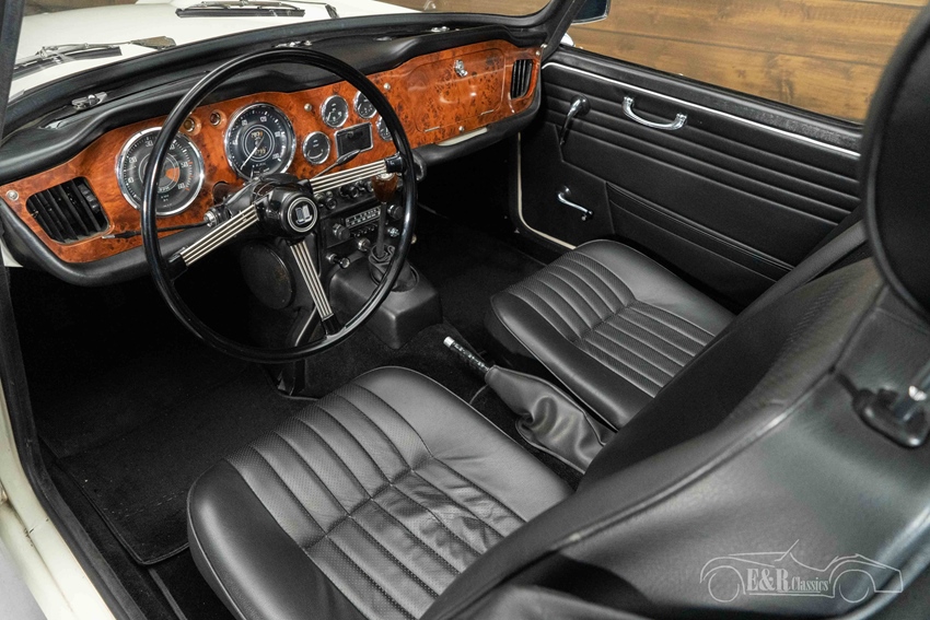 Triumph TR4A IRS met overdrive te koop Het exterieur is uitgevoerd in stijlvol Old English White lakwerk dat prachtig contrasteert met de zwarte soft top. Aan de achterzijde bevindt zich een kofferrek met klassieke koffer, wat de auto een charmante vintage uitstraling geeft. De originele stalen velgen met chroomdetails completeren het tijdloze design. Binnenin vinden we luxe kuipstoelen met hoofdsteun in zwart kunstleder, een houten dashboard met klassieke instrumenten en een sportief stuurwiel. Het samenspel van hout, chroom en leer zorgt voor een warme, authentieke sfeer die helemaal past bij het karakter van deze Britse roadster.