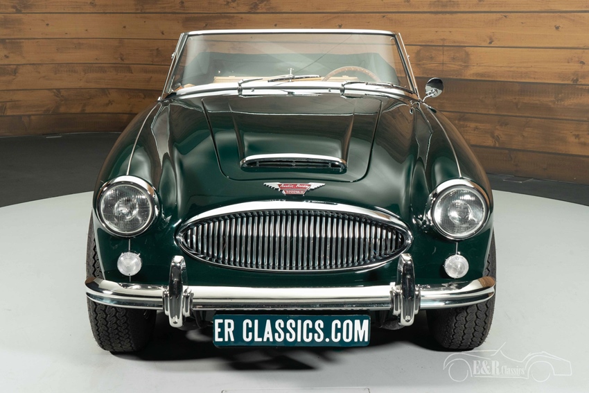 Austin-Healey 3000 MK3 in British Racing Green te koop Qua uiterlijk is deze klassieker uitgevoerd in het tijdloze British Racing Green lakwerk, dat prachtig combineert met de chromen spaakwielen en de zwarte soft top. Het interieur straalt luxe en klasse uit met zijn beigekleurig lederen bekleding en Moto Lita sportstuur, dat de sportieve rijbeleving compleet maakt. Het samenspel tussen het stijlvolle interieur en het klassieke exterieur maakt deze Austin-Healey tot een unieke verschijning, klaar om zowel bewondering als rijplezier te bieden.