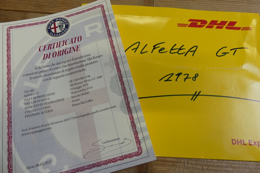 Deze stijlvolle Alfetta werd in 1978 nieuw geleverd door de officiële Alfa Romeo dealer Maurizio Dompè uit Ancona, Italië.