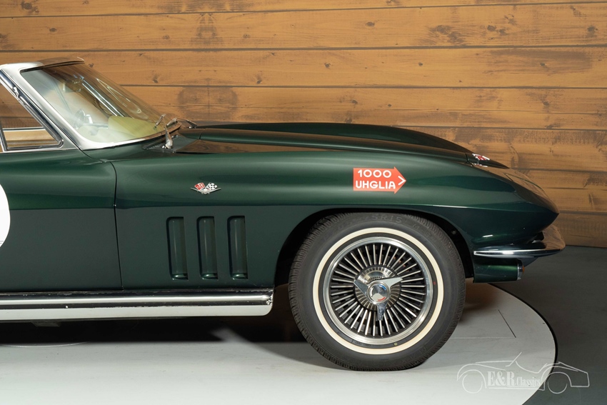 Chevrolet Corvette C2 Stingray Cabriolet in Glen Green Het exterieur van deze Corvette straalt klasse uit met zijn diepdonkergroene Glen Green lakwerk, perfect gecombineerd met een beigekleurige soft top en stijlvolle "Knock Off" wielen die het sportieve karakter benadrukken. Het luxe interieur is afgewerkt met beigekleurige bekleding, wat prachtig contrasteert met het exterieur en een warm, elegant geheel vormt. Authentieke details zoals de originele Delco AM/FM radio, houten stuurwiel en chromen accenten brengen de jaren zestig tot leven, terwijl het dashboard en tapijt in bijpassende tinten de harmonie van het interieur versterken.