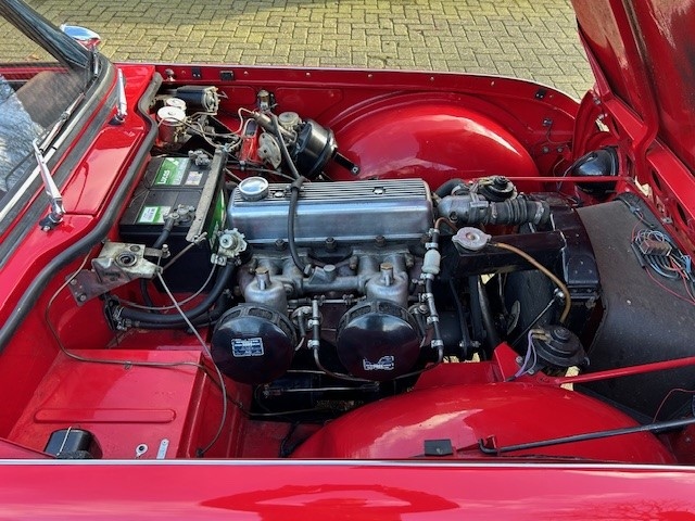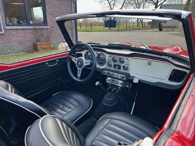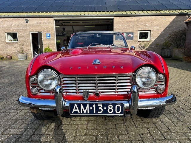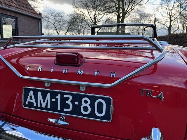 Ongelooflijk mooie, zeer vroege Triumph TR4 uit 1961. Deze Signal Red TR is onlangs body off gerestaureerd, ongeveer 8 jaar geleden was de TR klaar. Het chassis en de ophanging zijn eerst gedaan, ondertussen is de motor volledig gereviseerd. Daarna is de hele carrosserie onder handen genomen. De auto heeft superstrak plaatwerk met prachtige glanzende lak. De auto is volledig gedaan door een Nederlandse klassiekerliefhebber, hij heeft alles als fabrieksorigineel gemaakt. De man heeft uitstekend werk geleverd, het chassis is volledig gereviseerd en het plaatwerk is ongelooflijk strak en prachtig en professioneel gespoten. Het chroomwerk rondom de auto is nog steeds als nieuw. Onder de motorkap is het net als de buitenkant, het ziet eruit als nieuw, ongelooflijk. De motor en versnellingsbak zijn volledig gereviseerd en zijn in onberispelijke staat. De carburateurs zijn de betrouwbare HS-versie van SU. Het aluminium kleppendeksel maakt het sportiever en sluit beter dan het origineel. Het interieur is allemaal uitgevoerd in het zwart met witte biezen. Er is een nieuwe zwarte tapijtset gemonteerd en het dashboard is wit gespoten, zoals standaard op vroege auto's. Het dashboard is vernieuwd en de meters zijn gereviseerd en werken perfect. Een iconisch kenmerk van deze auto zijn de ongelooflijk zeldzame Silverstone Magnesium-wielen van American Racing Equipment (ARE). Deze wielen werden begin jaren 60 gebruikt op competitie- en raceauto's. Later waren ze beschikbaar als een dure optie op fabrieksmatig gebouwde TR4-5 en 6's. Ze werden maar een paar jaar gemaakt, tegenwoordig zijn ze extreem zeldzaam. Het stuurwiel is een lederen Moto Lita MKIII-stuurwiel, een bekend merk onder liefhebbers van klassieke auto's en een perfecte match met een uitstekende grip. De softtop is gloednieuw en gemaakt van zwart vinyl. Er is een nieuwe zwarte vinyl tonneacover beschikbaar om de cockpit af te sluiten. Natuurlijk rijd je het liefst met het dak open, maar zelfs met het dak dicht is de TR4 prachtig. De auto wordt geleverd met een complete map met facturen en foto's van de restauratie. Eventuele exportpapieren zijn altijd inbegrepen in onze prijs. Wij kunnen het transport voor u regelen voor een eerlijke prijs.