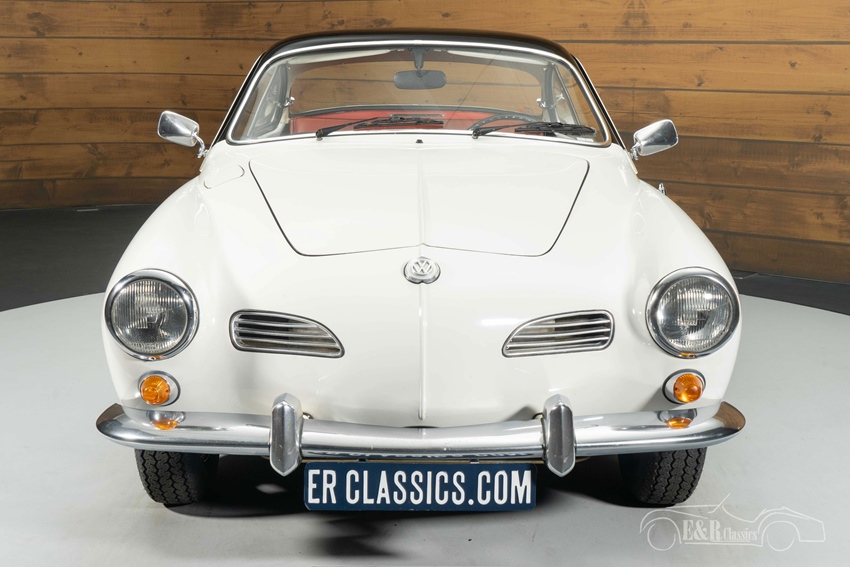 VW Karmann Ghia Coupe in Pearl White te koop Het elegante Pearl White lakwerk met zwart dak benadrukt perfect de ronde vormen en het sierlijke silhouet van de Karmann Ghia. In het interieur komt de stijl van de jaren ’60 prachtig tot leven dankzij de rode bekleding en het met hout afgewerkte dashboard. De auto straalt klasse en originaliteit uit, met behoud van originele onderdelen die bij de restauratie zorgvuldig zijn meegenomen. Een stijlvolle en technisch verzorgde klassieker, klaar voor een nieuwe eigenaar die oog heeft voor vakwerk en design.