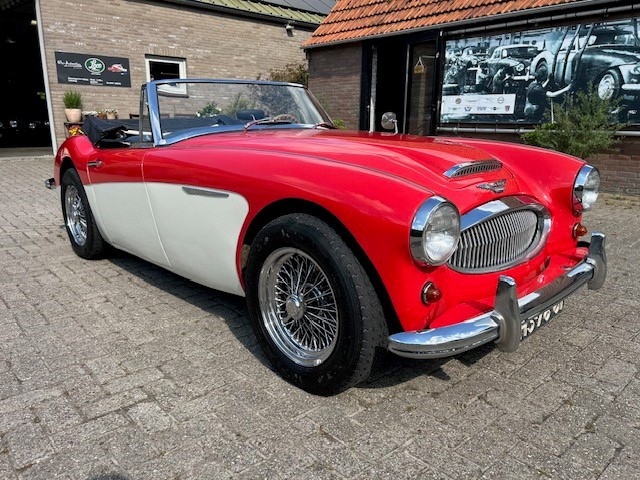 Very nice original Dutch Austin Healey MKIII, BJ8 with overdrive from 1964 in Red over White. This Austin Healey is not an over the top restored car but a excellent drivers car in very nice condition. An original Dutch Austin Helaey is a rarity itself , try to find one! The car is restored back in te days. The body was full repainted and build up by an Dutch enthousiast. The paintwork is still neat and proper, don't expect a full restored car, it's just a proper car with some patina on it . The engine and overdrive gearbox were full rebuild back in the days and are still in excellent condition. The straight 6 runs superb smooth and the overdrive gearbox works perfect. The car is all years very well maintained. This BJ8 is fitted with a full blue leather interior , lovely matching carpetset and has nice wide Dunlop wire wheels fitted. The car has a good vinyl black softtop fitted and a black hoodcover. An original factory steering wheel is fitted, still the best choice with the wooden dash . All gauges are in perfect working order. The car has a valid Dutch licence. Included in our price are always the correct export papers to make registration in another country easy. We can arrange transport for a fair fee. Who's the first to enjoy this most wanted Healey BJ8 ?