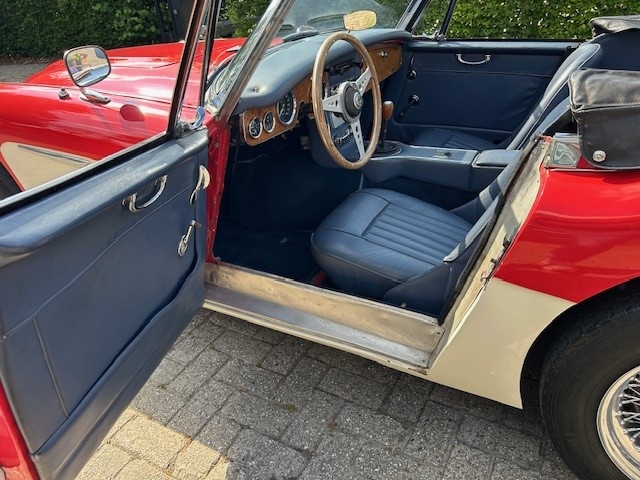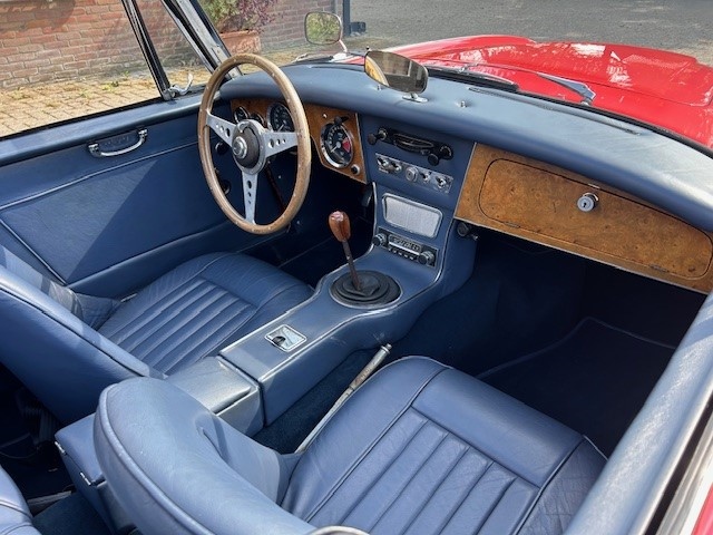 Mooie originele Nederlandse Austin Healey MKIII, BJ8 met overdrive uit 1964 in Red over White . Deze Austin Healey is geen over de top gerestaureerde auto, maar een uitstekende rijdersauto in zeer mooie staat. Een originele Nederlandse Austin Healey is een zeldzaamheid op zich, probeer er maar eens een te vinden! De auto is vroeger gerestaureerd. De carrosserie is volledig overgespoten en opgebouwd door een Nederlandse liefhebber. Het lakwerk is nog steeds netjes en in goede staat, verwacht geen volledig gerestaureerde auto, het is gewoon een nette auto met wat patina erop. De motor en overdrive-versnellingsbak zijn destijds volledig gereviseerd en zijn nog steeds in uitstekende staat. De zes-in-lijn loopt super soepel en de overdrive-versnellingsbak werkt perfect. De auto is door de jaren heen zeer goed onderhouden. Deze BJ8 is voorzien van een volledig blauw lederen interieur, mooie bijpassende tapijtset en mooie brede Dunlop spaakwielen. De auto heeft een goede zwarte vinyl softtop en een zwarte hoodcover. Er is een origineel fabrieksstuurwiel gemonteerd, nog steeds de beste keuze met het houten dashboard. Alle meters werken perfect. De auto beschikt over een geldig Nederlands kenteken. Bij de prijs zijn altijd de juiste exportpapieren inbegrepen, zodat registratie in het buitenland eenvoudig is. Transport kunnen wij regelen tegen een eerlijke prijs. Wie is de eerste die van deze gewilde Healey BJ8 kan genieten ?