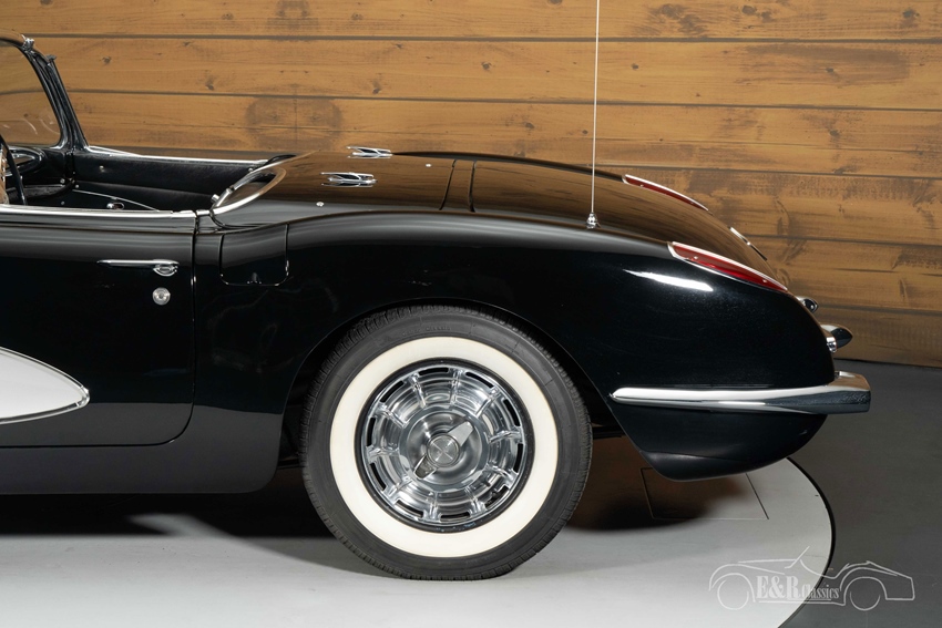 Chevrolet Corvette C1 Cabriolet in Triple Black te koop Het oogstrelende Triple Black-uiterlijk (zwart lakwerk, zwart interieur en zwarte soft top) wordt fraai geaccentueerd door de contrasterende zilverkleurige zijpanelen en klassieke whitewall-banden op originele chromen velgen. Deze Corvette wordt geleverd met zowel een hard top als een soft top, waardoor hij zich moeiteloos aan elk seizoen aanpast. Het interieur ademt authenticiteit, met zijn karakteristieke dashboard, driedelig stuurwiel en perfect gerestaureerde bekleding — een tijdloze mix van elegantie en sportiviteit.