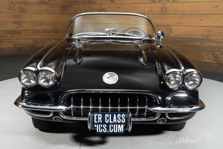 Chevrolet Corvette C1 Cabriolet in Triple Black te koop Het oogstrelende Triple Black-uiterlijk (zwart lakwerk, zwart interieur en zwarte soft top) wordt fraai geaccentueerd door de contrasterende zilverkleurige zijpanelen en klassieke whitewall-banden op originele chromen velgen. Deze Corvette wordt geleverd met zowel een hard top als een soft top, waardoor hij zich moeiteloos aan elk seizoen aanpast. Het interieur ademt authenticiteit, met zijn karakteristieke dashboard, driedelig stuurwiel en perfect gerestaureerde bekleding — een tijdloze mix van elegantie en sportiviteit.