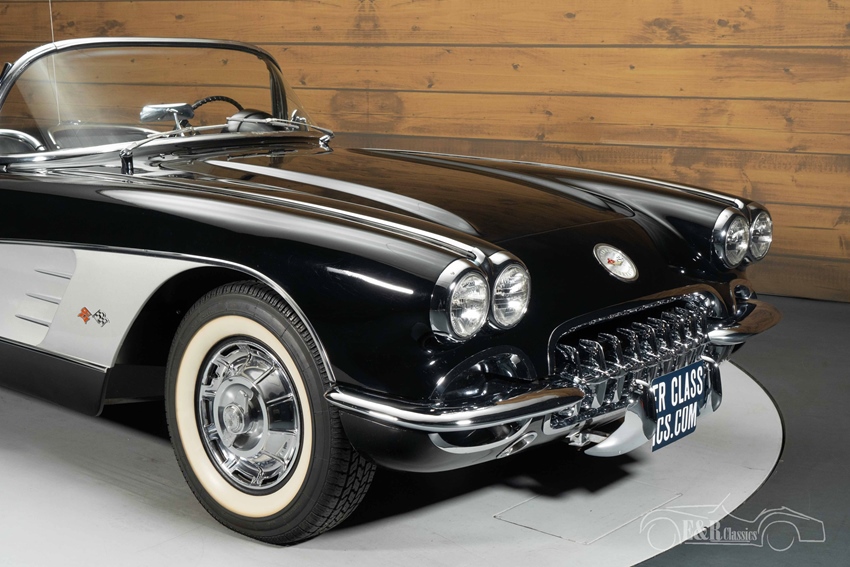 Chevrolet Corvette C1 Cabriolet in Triple Black te koop Het oogstrelende Triple Black-uiterlijk (zwart lakwerk, zwart interieur en zwarte soft top) wordt fraai geaccentueerd door de contrasterende zilverkleurige zijpanelen en klassieke whitewall-banden op originele chromen velgen. Deze Corvette wordt geleverd met zowel een hard top als een soft top, waardoor hij zich moeiteloos aan elk seizoen aanpast. Het interieur ademt authenticiteit, met zijn karakteristieke dashboard, driedelig stuurwiel en perfect gerestaureerde bekleding — een tijdloze mix van elegantie en sportiviteit.