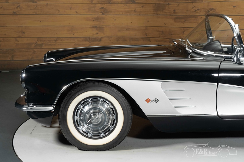 Chevrolet Corvette C1 Cabriolet in Triple Black te koop Het oogstrelende Triple Black-uiterlijk (zwart lakwerk, zwart interieur en zwarte soft top) wordt fraai geaccentueerd door de contrasterende zilverkleurige zijpanelen en klassieke whitewall-banden op originele chromen velgen. Deze Corvette wordt geleverd met zowel een hard top als een soft top, waardoor hij zich moeiteloos aan elk seizoen aanpast. Het interieur ademt authenticiteit, met zijn karakteristieke dashboard, driedelig stuurwiel en perfect gerestaureerde bekleding — een tijdloze mix van elegantie en sportiviteit.