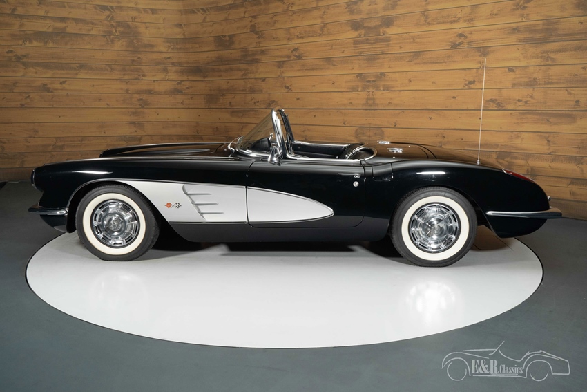 Chevrolet Corvette C1 Cabriolet in Triple Black te koop Het oogstrelende Triple Black-uiterlijk (zwart lakwerk, zwart interieur en zwarte soft top) wordt fraai geaccentueerd door de contrasterende zilverkleurige zijpanelen en klassieke whitewall-banden op originele chromen velgen. Deze Corvette wordt geleverd met zowel een hard top als een soft top, waardoor hij zich moeiteloos aan elk seizoen aanpast. Het interieur ademt authenticiteit, met zijn karakteristieke dashboard, driedelig stuurwiel en perfect gerestaureerde bekleding — een tijdloze mix van elegantie en sportiviteit.
