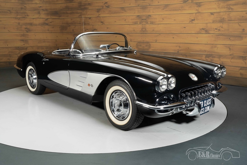 Chevrolet Corvette C1 Cabriolet in Triple Black te koop Het oogstrelende Triple Black-uiterlijk (zwart lakwerk, zwart interieur en zwarte soft top) wordt fraai geaccentueerd door de contrasterende zilverkleurige zijpanelen en klassieke whitewall-banden op originele chromen velgen. Deze Corvette wordt geleverd met zowel een hard top als een soft top, waardoor hij zich moeiteloos aan elk seizoen aanpast. Het interieur ademt authenticiteit, met zijn karakteristieke dashboard, driedelig stuurwiel en perfect gerestaureerde bekleding — een tijdloze mix van elegantie en sportiviteit.