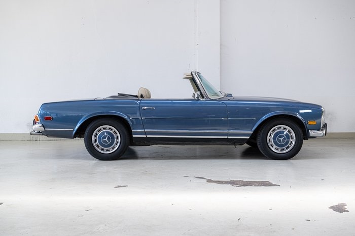 BODYWORK & PAINT This Mercedes-Benz 280 SL, better known as the legendary “Pagoda,” was originally delivered in 1971 in Carmel, California. The car was imported to the Netherlands in 1999 by an enthusiast, where it has since been carefully maintained and preserved. The body is finished in its original colour, Grau Blau Metallic (code 906) — an elegant shade that contrasts beautifully with the beige leather interior. The paintwork presents a deep shine, with only a few light imperfections on the bonnet and boot lid consistent with the car's age, adding a wonderful sense of patina and character. There is no rust or denting; overall, the car presents as very well cared for. The body panels are straight and properly aligned, with tight and even gaps throughout. All chrome elements — including bumpers, trim and mirrors — are complete, bright, and free from pitting or corrosion. The soft top fits neatly, and the optional hardtop, with its distinctive “Pagoda” roofline, is likewise in excellent condition. TECHNICAL CONDITION Mechanically, this 280 SL is in outstanding condition. The inline six-cylinder engine (M130) with 2,778 cc runs exceptionally smoothly, delivering its power in a linear and refined manner. The car starts effortlessly, both hot and cold, and the automatic transmission shifts seamlessly. Braking is firm and stable, while the steering is precise and predictable — hallmarks of Mercedes-Benz quality from this golden era. This Pagoda has been tastefully enhanced with several modern upgrades that improve comfort without compromising originality: - Air conditioning - Becker Mexico radio - Cruise control - Stainless-steel exhaust system (for a subtly sporty tone) - Tracking system / alarm The car has been meticulously maintained for many years by Van Dijk, the renowned Dutch SL specialist. The service history is fully documented with all invoices present. Engine, gearbox, and chassis are in top condition, with no leaks or mechanical issues reported. INTERIOR The interior is trimmed in original beige leather, which remains in beautiful condition. The seats are comfortable and show only minimal, age-appropriate wear. Dashboard, carpeting, and door panels are clean and original. All instruments function correctly, and all electrical components (lighting, wipers, blower, radio, etc.) operate as they should. The original bakelite steering wheel remains — a charming detail of this timeless classic. DOCUMENTATION This Mercedes-Benz 280 SL comes with comprehensive documentation, including: - Dutch registration and title- - Import history from California (1999) - Complete service invoices from Van Dijk (1999–2025) - Valuation reports - Owner's manual and Becker documentation ADDITIONAL INFORMATION This particular example stands out for its long, well-documented Dutch maintenance history, stunning and original colour combination, and superb mechanical condition — making it one of the finer examples available on the market today.
