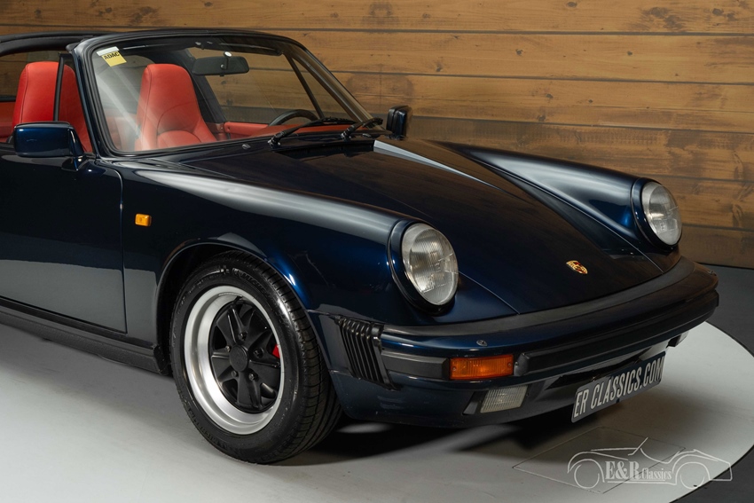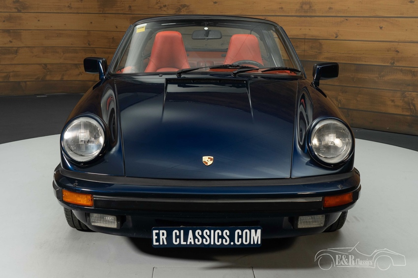 Porsche 911 Carrera Targa in Midnight Blue te koop Deze Porsche 911 Carrera Targa uit 1985 is uitgevoerd in de prachtige kleur Midnight Blue, een diepe blauwtint die schittert onder het licht en het iconische ontwerp extra kracht bijzet. De originele, zwartgelakte Fuchs-velgen geven de auto een extra sportieve uitstraling en passen perfect bij het contrastrijke uiterlijk. Het interieur van deze Targa is afgewerkt in levendig rood leer, dat prachtig combineert met de Midnight Blue-lak. De sportstoelen zijn comfortabel en bieden uitstekende ondersteuning, zowel bij ontspannen ritten als bij dynamisch rijden. Het dashboard en de deurpanelen zijn eveneens afgewerkt in rood leer, wat het interieur een luxueuze, maar ook gedurfde uitstraling geeft.