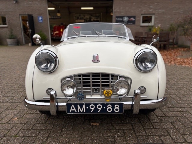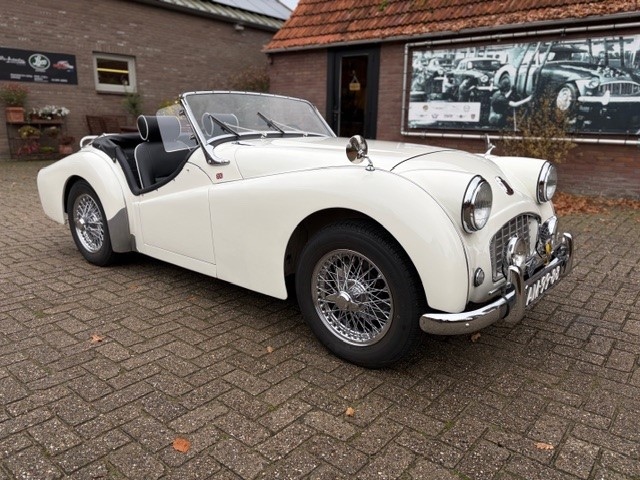 Prachtig gerestaureerde Triumph TR3 smallmouth uit 1957 met overdrive in Old English White. Deze TR3 is rond 2010 volledig gerestaureerd. Alles is onder handen genomen, de auto is vanaf nul, body-off, opnieuw opgebouwd. Het is een fantastisch onderhouden auto die nog steeds in nieuwstaat verkeert. Het lakwerk is werkelijk schitterend. De restauratie is gedocumenteerd met facturen en foto's die al het werk laten zien wat gedaan is. De TR3 smallmouth wordt steeds populairder en steeds moeilijker te vinden. Deze specifieke TR3 is uitgevoerd in Old English White met een zwart lederen interieur, een prachtige combinatie. De auto is uitzonderlijk netjes en volledig roestvrij. De motor en overdrive versnellingsbak zijn tijdens de restauratie gereviseerd en in perfecte staat. Het chroomwerk rondom is uitzonderlijk netjes. De auto staat op prachtige chromen Dunlop spaakwielen, die destijds een fabrieksoptie waren (ook het reservewiel is een spaakwiel). De auto heeft een uprated aluminium radiator, elektronische ontsteking, een high torque startmotor, een spin-on oliefilter, een zwarte vinyl softtop, zwarte vinyl sidescreens en windwings. De stoelen zijn sportieve bucketseats met geweldige zijdelingse steun, afgewerkt met zwart leer. De TR is optioneel uitgerust met een achterbank, een geweldige feature. De fabrieksverwarming is ook gemonteerd en werkt perfect. Een badgebar met originele Lucas spotlampen maakt de sportieve smallmouth neus compleet. Kom hem bekijken en u zult verliefd worden op deze prachtige, zeldzame smallmouth!