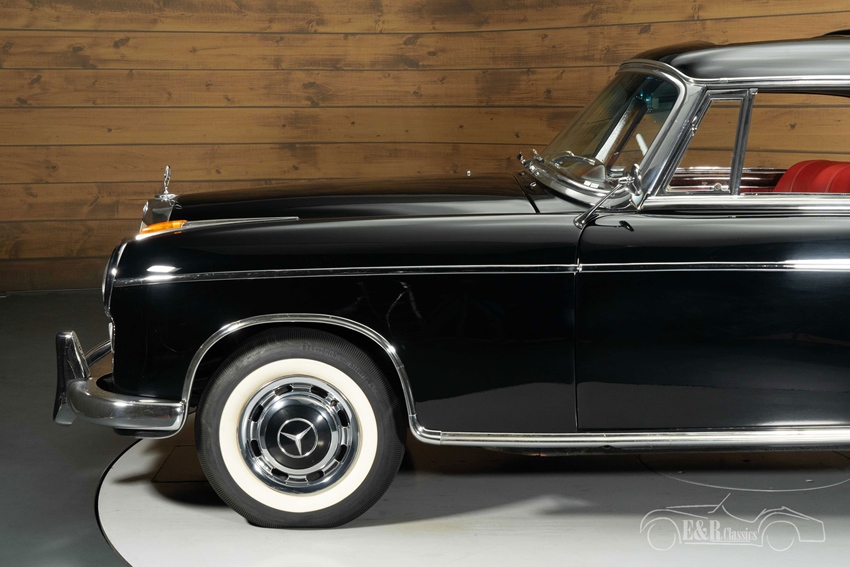 Zwarte Mercedes-Benz 220 S Ponton te koop Het uiterlijk is uitgevoerd in zwart lakwerk dat in 2004 opnieuw is aangebracht, met enkele lichte imperfecties die passen bij een auto van deze leeftijd. De combinatie met de whitewalls, originele wieldoppen en het klassieke schuifdak geeft de auto een tijdloze, luxe uitstraling. Het interieur is vernieuwd: rode bekleding, fraai gerestaureerd houtwerk inclusief dashboard en een nieuwe hemel creëren een warm, stijlvol samenspel met de donkere carrosserie. Deze 220 S Ponton is zowel optisch als technisch een bijzonder fraai exemplaar met veel liefde en zorg opgebouwd.