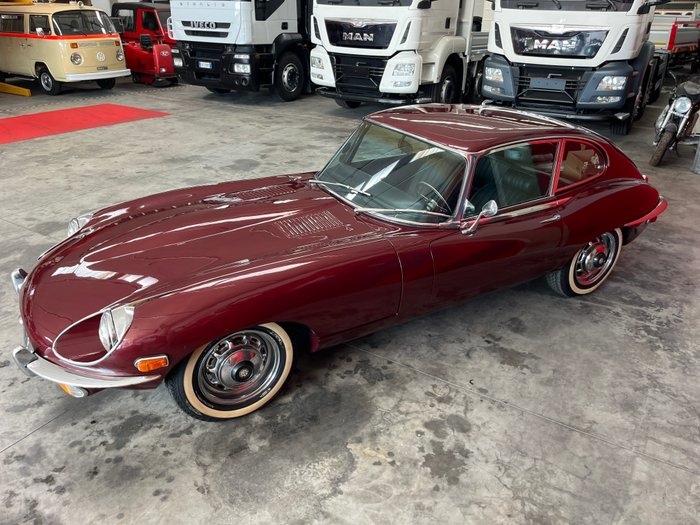 PANORAMISCH/VOORWAARDEN 1969 Jaguar E-Type Coupé Tweede Serie 4.2 Automaat. Het voertuig is in 2021 in Italië geregistreerd. Het land van herkomst en de vorige registratie zijn onbekend. De mechaniek is in orde, maar behoeft een onderhoudsbeurt en een onderhoudsbeurt. De auto is in 2021 goedgekeurd voor de keuring. De carrosserie is gaaf en roestvrij. Zoals u op de foto's kunt zien, is het lakwerk zichtbaar met ouderdomssporen. De onderkant is gaaf en vertoont slechts oppervlakkige corrosiesporen die schoongemaakt moeten worden. Het interieur is intact en behoeft slechts kleine verbeteringen. documentatie Een bijgevoegde Italiaanse documenten. Auto zichtbaar in Empoli, Italië.