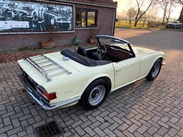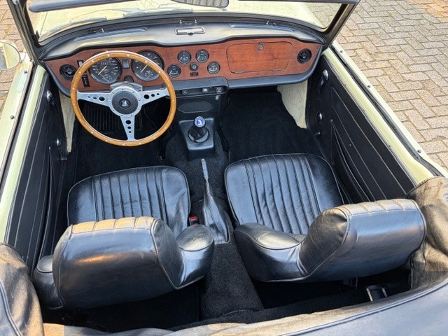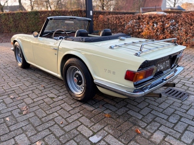 Ongelooflijk mooie vroege Triumph TR6 uit 1972. Een sublieme verschijning in deze machtige en zeldzame kleur Yasmin, met zwart interieur. Deze matching nummers TR6 ( Komt met Heritage certificaat) is in het verleden gerestaureerd en verkeert nog steeds in uitstekende staat. De auto is perfect onderhouden door Nederlandse oldtimer specialisten. De techniek van deze TR6 is in zeer goede staat. Het is een vroege auto, dus een CC carburateurmotor. De motor brult zoals een 6-in-lijn hoort te klinken en de versnellingsbak schakelt messcherp, als nieuw. De TR is voorzien van de van oorsprong betrouwbare carburateurs met het standaard luchtfilterhuis. Een aluminium kleppendeksel maakt het geheel sportiever. De dubbele roestvrijstalen uitlaat zorgt voor het juiste prachtige geluid. De auto heeft net een onderhoudsbeurt gehad, so ready to hit the road. Een Kenlowe koelvin is gemonteerd voor het geval het een keer warm wordt. Het chassis is keihard en solide, standaard zwart gespoten en de naden van het plaatwerk zijn ongelooflijk netjes voor TR6-normen, waarschijnlijk beter dan het originele fabriekswerk. Als je onder de auto kijkt is hij precies zoals van boven, de onderzijde en in de wielkasten is alles gespoten in dezelfde Yasmin kleur, als origineel af-fabriek. Het plaatwerk is ongelooflijk strak en het lakwerk is uitstekend. De Triumph heeft 5 originele stalen velgen, dus ook de reservewiel. Het interieur is zeer netjes, de stoelen zijn de zelden geziene vroege exemplaren, prachtig met de vaste hoofdsteunen. De tapijtset is nagenoeg nieuw en afgewerkt in het zwart. De trimpanelen zijn zoals origineel uitgevoerd, in bijpassend zwart vinyl. De softtop en de hoodcover zijn beide van zwart vinyl. Het chroomwerk rondom is in goede staat. Een prachtig klassiek houten Moto Lita stuurwiel en het houten dashboard maken de klassieke sportieve look van deze 6 cilinder compleet. De auto heeft een geldig Nederlands kenteken. Voor buitenlandse kopers zijn de juiste exportpapieren op naam bij onze prijzen inbegrepen, dit om registratie in het buitenland gemakkelijk te maken. Bezorging is ook mogelijk tegen een kleine meerprijs. Kom luisteren naar het geluid dat deze 6-cilinder produceert, sportief rijden is nu mogelijk voor iedereen.