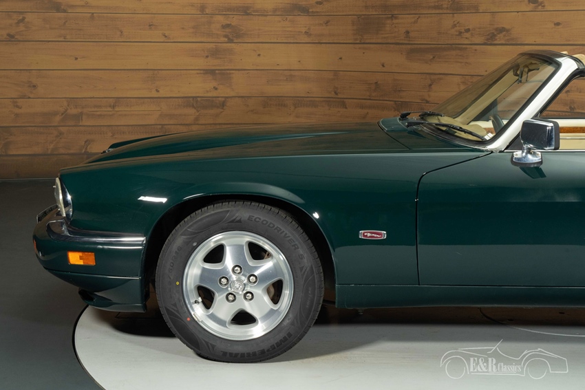 Jaguar XJS Cabriolet in British Racing Green te koop Wat direct opvalt, is het stijlvolle British Racing Green lakwerk, dat prachtig combineert met de beige elektrisch bedienbare soft top en het zeer nette, recent vernieuwde beigekleurige lederen interieur. De cabine ademt klassieke luxe, met het kenmerkende dashboard met houtinleg, comfortabele stoelen en moderne voorzieningen zoals climate control. De originele lichtmetalen velgen, het chroomwerk en de strakke carrosserielijnen benadrukken het klassieke, aristocratische karakter van deze XJS Convertible. Een schitterende verschijning voor liefhebbers van pure Britse elegantie.