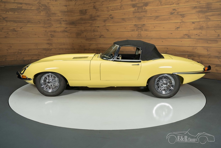 Jaguar E-Type Series 1 Cabriolet in Primrose Yellow te koop Optisch is deze E-Type minstens zo indrukwekkend. De carrosserie is uitgevoerd in het originele, Matching Numbers lakwerk ‘Pale Primrose Yellow’, een frisse pastelgele kleur die de slanke lijnen en gespierde wielkasten prachtig accentueert. De chroomdetails en de klassieke spaakwielen vormen een stijlvol contrast en onderstrepen het tijdloze ontwerp. Het Matching Numbers zwarte lederen interieur oogt als nieuw en sluit naadloos aan bij de zwarte soft top, waardoor het geheel een chique en sportieve uitstraling krijgt – zowel open als gesloten. In het interieur vindt u het karakteristieke dashboard, klassieke Smiths-meters en het houten sportstuur; samen creëren ze precies die authentieke E-Type sfeer waar verzamelaars en liefhebbers naar zoeken.