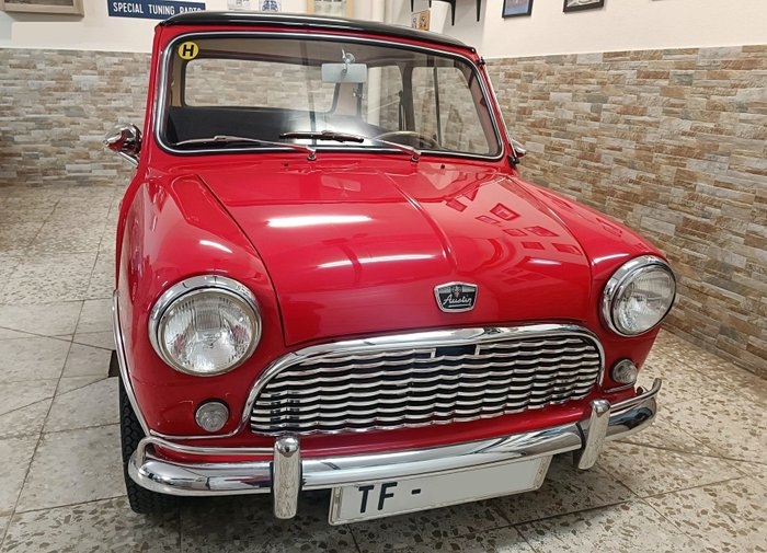 Austin Mini Super de Luxe, 08/1965, nieuw verkocht op Tenerife (Spanje) waar hij tot 2022 heeft gestaan, gecertificeerd door British Motor Heritage, upgrade van de ophanging met vervanging van hydrolastic door konussen van topkwaliteit, motor 998cc uit de jaren 70, conversie naar schijfremmen en velgen type Cooper 3,5 inch. Motolita stuurwiel. Auto met geldige APK en in perfecte staat van gebruik. De auto is niet gerestaureerd; voor een perfecte staat zou ik moeten schilderen en de onderkant van de carrosserie vervangen. De motor werkt heel goed. De auto heeft de volgende werkzaamheden ondergaan: compleet nieuw remsysteem (pomp, slangen, remblokken, conversie naar schijven), compleet stuurmechanisme (stuurhuis en draagarmen), compleet veringsysteem (kegels, schokdempers, stillebussen), startmotor, Dynamator (alternator met look van dynamo), koppelingpomp en slavecilinder, brandstofpomp, tapijt, schuimen van de stoelen, bekleding van het plafond en achterbak in cream crackle. De auto bevindt zich in Málaga (Spanje). Het is raadzaam het voertuig te bekijken voordat je biedt om teleurstellingen achteraf te voorkomen. Voor een afspraak om het voertuig te bekijken, neem contact op met Catawiki.