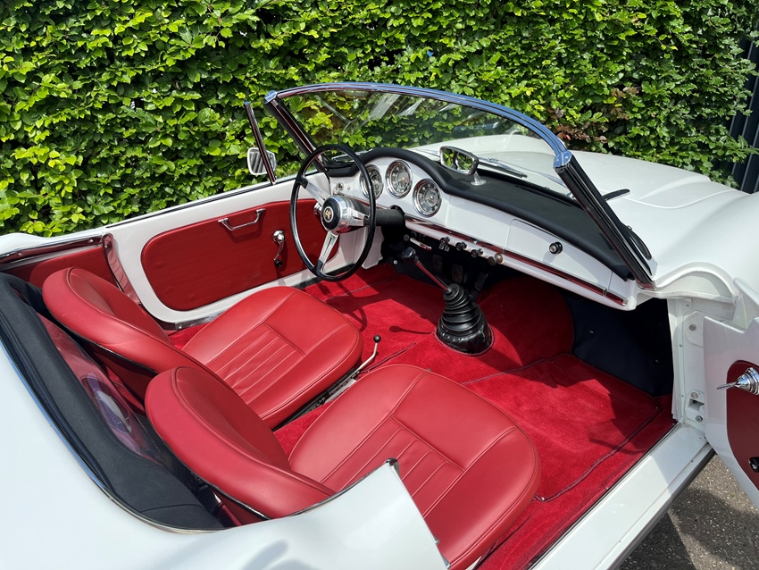 Alfa Romeo Giulia Spider uit 1962. Deze zeer elegante auto hebben wij weer in zijn oorspronkelijke staat terug gebracht. Het betreft hier een uit Californie geimporteerde auto met een fantastische koets die geheel roest en schade vrij was. Dat is naar onze mening de perfecte basis voor een restauratie. Het geheel was compleet en de originele motor en versnellingsbak zaten nog in de auto. De koets is geheel ontdaan van alle laklagen alvorens we hem weer in een nieuw jasje hebben gestoken. een "Bare Metal" restauratie dus. Kosten nog moeite zijn gespaard gebleven om tot dit resultaat te komen. De beste materialen van diverse leveranciers uit binnen en buitenland hebben wij hiervoor gebruikt.