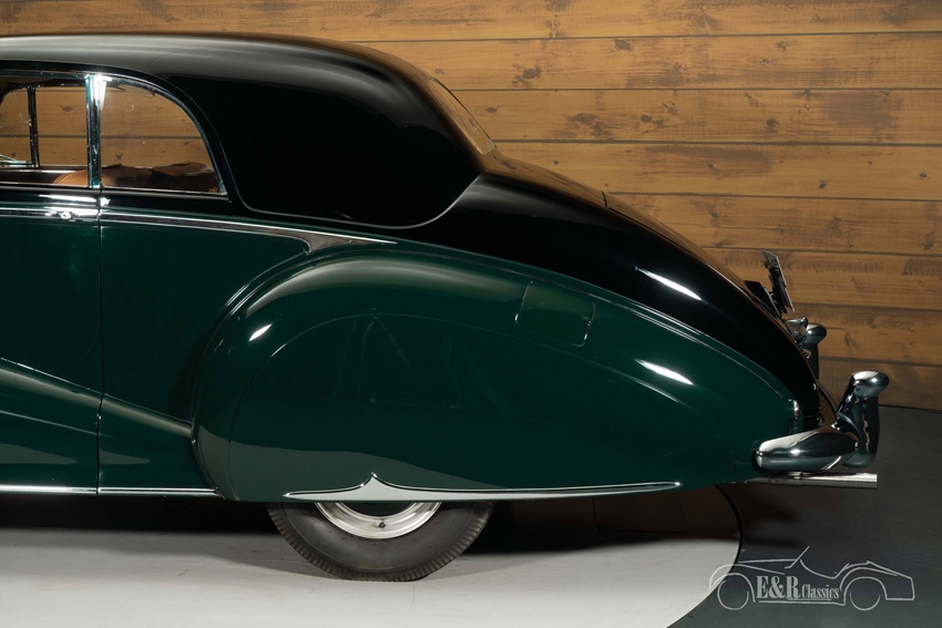 Links gestuurde Bentley R-Type Park Ward Coupé Het exterieur is uitgevoerd in stijlvol zwart lakwerk met subtiele donkergroene accenten, een klassieke en bijzonder chique kleurstelling die de elegante lijnen van de Park Ward-carrosserie prachtig benadrukt. De afwerking toont het vakmanschap van de restauratie en sluit naadloos aan bij de luxueuze uitstraling van het interieur. Binnenin wordt u verwelkomd door een warm tan lederen interieur, dat fraai contrasteert met het donkere exterieur en wordt aangevuld met verfijnde details en hoogwaardige materialen. Het samenspel tussen lakwerk, leer en interieurafwerking onderstreept het exclusieve karakter van deze Bentley, die niet alleen zeldzaam is op papier, maar ook in uitstraling en beleving.