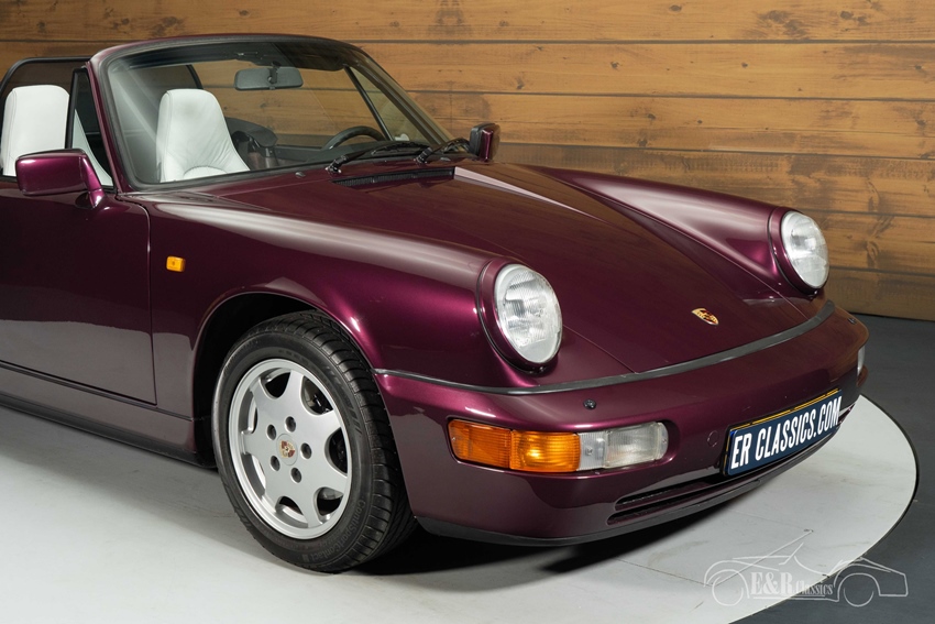 Porsche 911 Carrera 4 Cabriolet in Porsche Amethyst metallic Het uiterlijk is bijzonder stijlvol dankzij het zeldzame Porsche Amethyst metallic lakwerk, dat perfect combineert met de zwarte Mohair soft top. De klassieke Cup-velgen benadrukken het sportieve karakter en passen naadloos bij de tijdloze lijnen van de 964. Het interieur is uitgevoerd in grijs leder met paars tapijt, een opvallende en smaakvolle combinatie die mooi aansluit bij de carrosseriekleur. Daarnaast is deze Porsche voorzien van airconditioning, elektrisch verstelbare en verwarmbare stoelen en een moderne Continental DAB radio, waardoor comfort en originaliteit hand in hand gaan. Een cabriolet die zowel visueel als technisch indruk maakt en klaar is om van te genieten.