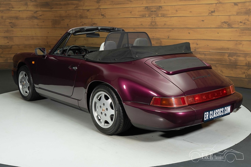 Porsche 911 Carrera 4 Cabriolet in Porsche Amethyst metallic Het uiterlijk is bijzonder stijlvol dankzij het zeldzame Porsche Amethyst metallic lakwerk, dat perfect combineert met de zwarte Mohair soft top. De klassieke Cup-velgen benadrukken het sportieve karakter en passen naadloos bij de tijdloze lijnen van de 964. Het interieur is uitgevoerd in grijs leder met paars tapijt, een opvallende en smaakvolle combinatie die mooi aansluit bij de carrosseriekleur. Daarnaast is deze Porsche voorzien van airconditioning, elektrisch verstelbare en verwarmbare stoelen en een moderne Continental DAB radio, waardoor comfort en originaliteit hand in hand gaan. Een cabriolet die zowel visueel als technisch indruk maakt en klaar is om van te genieten.