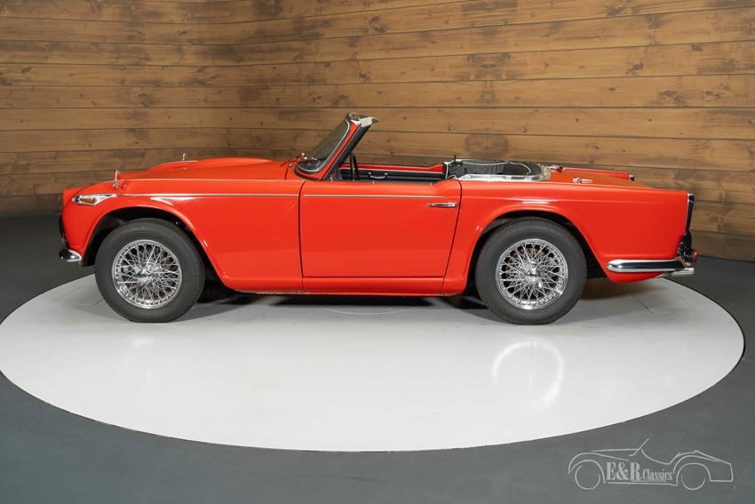 Rode Triumph TR4 met overdrive te koop Het rode lakwerk van deze Triumph TR4 benadrukt de sportieve lijnen van de carrosserie, terwijl de glanzende chromen spaakwielen zorgen voor een elegante en klassieke uitstraling. Het zwarte interieur vormt een stijlvol contrast met de levendige buitenkleur en ademt pure jaren ’60-charme. Het dashboard, met zijn originele instrumenten en driespaaks stuurwiel, versterkt het karakter van deze roadster. De zwarte softtop maakt het plaatje compleet en biedt flexibiliteit bij wisselvallig weer – ideaal voor zomerse ritten en klassieke toertochten.