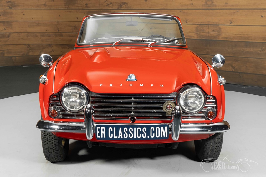 Rode Triumph TR4 met overdrive te koop Het rode lakwerk van deze Triumph TR4 benadrukt de sportieve lijnen van de carrosserie, terwijl de glanzende chromen spaakwielen zorgen voor een elegante en klassieke uitstraling. Het zwarte interieur vormt een stijlvol contrast met de levendige buitenkleur en ademt pure jaren ’60-charme. Het dashboard, met zijn originele instrumenten en driespaaks stuurwiel, versterkt het karakter van deze roadster. De zwarte softtop maakt het plaatje compleet en biedt flexibiliteit bij wisselvallig weer – ideaal voor zomerse ritten en klassieke toertochten.