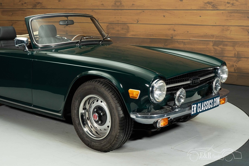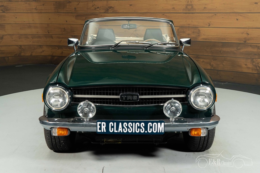 Triumph TR6 in British Racing Green te koop Het exterieur is uitgevoerd in het klassieke British Racing Green lakwerk, dat prachtig combineert met het chroomwerk en de gemonteerde verstralers aan de voorzijde. De auto wordt geleverd met zowel een hardtop als een beigekleurige softtop, waardoor hij geschikt is voor alle seizoenen. Het interieur is uitgevoerd in zwarte bekleding en ademt pure jaren-70 sportiviteit, versterkt door het fraaie houten MotoLita stuurwiel. Het contrast tussen het donkere interieur en het diepe groene lakwerk zorgt voor een stijlvolle en tijdloze uitstraling die deze Triumph TR6 tot een zeer begeerlijke klassieker maakt.