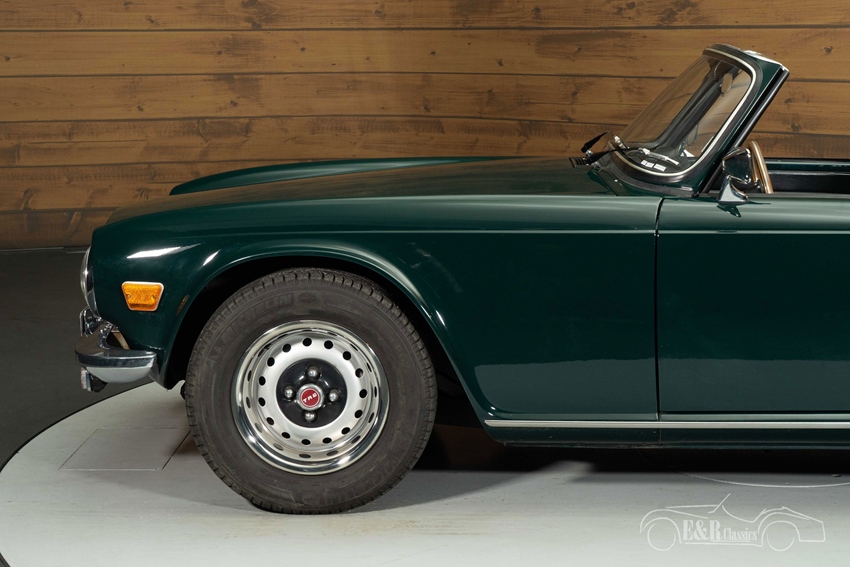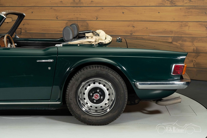 Triumph TR6 in British Racing Green te koop Het exterieur is uitgevoerd in het klassieke British Racing Green lakwerk, dat prachtig combineert met het chroomwerk en de gemonteerde verstralers aan de voorzijde. De auto wordt geleverd met zowel een hardtop als een beigekleurige softtop, waardoor hij geschikt is voor alle seizoenen. Het interieur is uitgevoerd in zwarte bekleding en ademt pure jaren-70 sportiviteit, versterkt door het fraaie houten MotoLita stuurwiel. Het contrast tussen het donkere interieur en het diepe groene lakwerk zorgt voor een stijlvolle en tijdloze uitstraling die deze Triumph TR6 tot een zeer begeerlijke klassieker maakt.