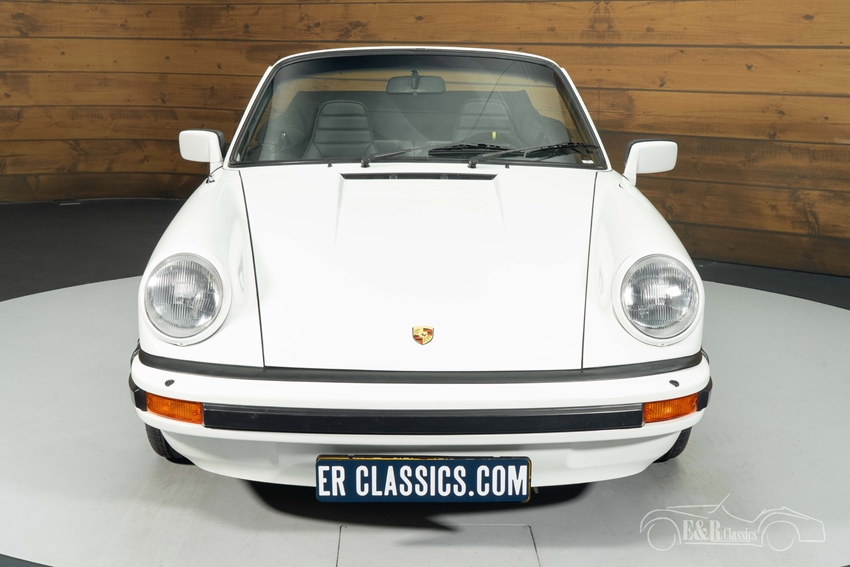 Porsche 911 SC Cabriolet in Grand Prix wit te koop Het exterieur is uitgevoerd in het tijdloze Grand Prix wit, een kleur die perfect past bij de klassieke lijnen van het G-model. De zwarte velgen geven de auto een sportieve uitstraling en vormen een fraai contrast met het lakwerk. Ook het interieur is stijlvol gehouden in zwart, wat mooi samengaat met het exterieur. De stoelen, het dashboard en de afwerking ademen de typische Porsche-sfeer van de jaren ’80. De zwarte soft top verkeert in nette staat en maakt deze 911 SC Cabriolet zowel open als gesloten tot een bijzonder aantrekkelijke klassieker.