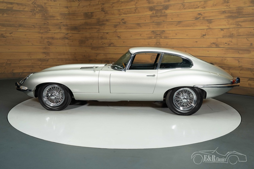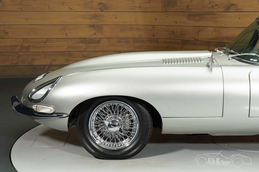Zilvergrijs metallic Jaguar E-Type Series 1 Coupe te koop Het exterieur van deze E-Type Series 1 is uitgevoerd in stijlvol zilvergrijs metallic lakwerk, dat perfect aansluit bij de elegante lijnen van de E-Type. De klassieke Series 1 koplampen en achterlichten onderstrepen het tijdloze karakter, terwijl de chromen spaakwielen zorgen voor een authentieke en luxe uitstraling. Ook het interieur is geheel in lijn met het exterieur: een zwart lederen interieur dat fraai contrasteert met het koetswerk en een sportieve, maar comfortabele ambiance creëert. Stuurbekrachtiging verhoogt het rijcomfort, zonder afbreuk te doen aan het klassieke gevoel. Het samenspel tussen kleurstelling, materialen en details maakt deze Jaguar tot een indrukwekkende verschijning, zowel rijdend als stilstaand.