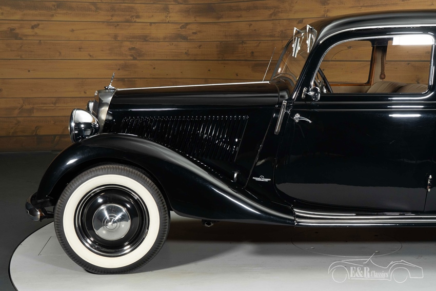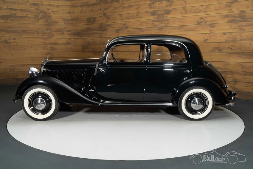 Zwarte Mercedes-Benz 170 VA te koop Het exterieur is uitgevoerd in stijlvol zwart lakwerk, dat prachtig combineert met de klassieke whitewall banden en de verfijnde chroomdetails. De carrosserielijnen zijn elegant en tijdloos, met als karakteristiek detail het reservewiel dat netjes in de kofferbak is geplaatst. Het interieur is uitgevoerd in bruin stof en straalt authenticiteit en warmte uit, geheel passend bij het karakter van deze jaren ’50 Mercedes. Het samenspel tussen het donkere exterieur en het lichte interieur zorgt voor een klassieke, chique uitstraling die deze 170 VA tot een echte blikvanger maakt, zowel stilstaand als rijdend.