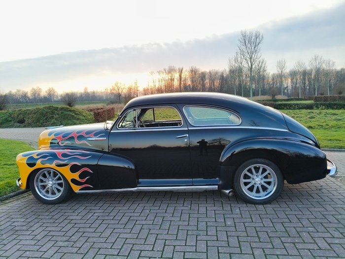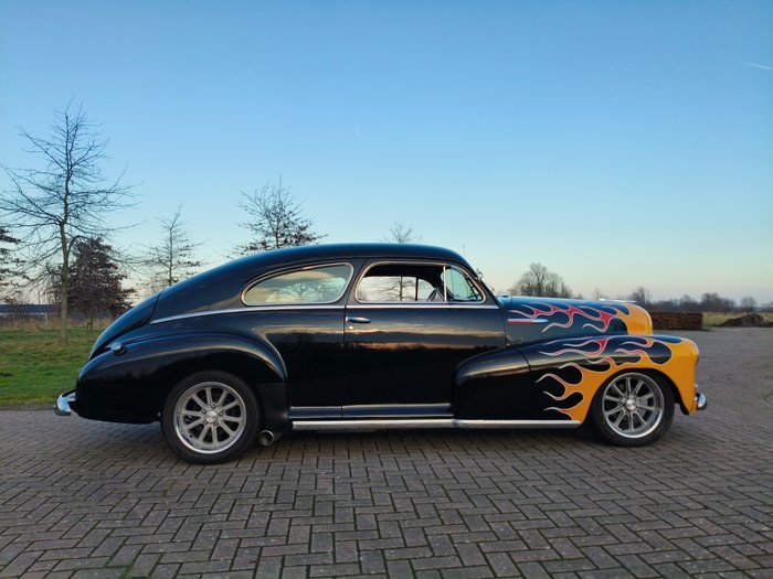 1948 Chevrolet Fleetmaster – 350 V8 - 330 PK – HOT ROD Algemene informatie: Te koop aangeboden: een stijlvolle Chevrolet Fleetmaster voorzien van een krachtige 350 V8 met circa 330 pk. Deze klassieke Amerikaan combineert het elegante design uit de jaren '40 met moderne V8-prestaties en een comfortabele rijervaring. Carrosserie & Lakwerk: De carrosserie verkeert in nette staat en heeft een opvallende, zwarte lak met prachtige vlammen die het klassieke design van de Fleetmaster extra kracht bijzet. Hier en daar lichte gebruikssporen passend bij een klassieke auto van deze leeftijd. Technisch: De Fleetmaster is uitgerust met een krachtige 350 V8 die zorgt voor indrukwekkende prestaties en een karaktervol diep motorgeluid. De auto heeft een Hot Rod Suspension van Heidts, waardoor de wegligging en het rijcomfort aanzienlijk zijn verbeterd. In combinatie met de automatische transmissie is dit een zeer prettig rijdende klassieker, perfect voor zowel shows als ontspannen toer ritten. Rem en Stuurbekrachtiging mogen uiteraard niet ontbreken, alsook schijfremmen aan de voorzijde om al dit moois tot stoppen te dwingen Interieur: Het interieur is netjes en verzorgd en sluit mooi aan bij het klassieke karakter van de auto. Er zijn vele chroom accenten die de 40's extra benadrukken. De kleur en stofkeuze passen heel mooi bij het exterieur. De bekleding, deuranelen en het dashboard zijn nog in keurige conditie. Documentatie: Nederlands kentekenbewijs Afhaling / Transport: De auto kan worden afgehaald in Appingedam. Transport is mogelijk in overleg. Samenvatting: Een opvallende Chevrolet Fleetmaster met krachtige 350 V8 met 330 pk, Hot Rod Suspension van Heidts, zwarte lak met prachtige vlammen en stijlvolle American Racing velgen. Klassieke uitstraling gecombineerd met moderne prestaties, rijklaar en voorzien van Nederlands kenteken.