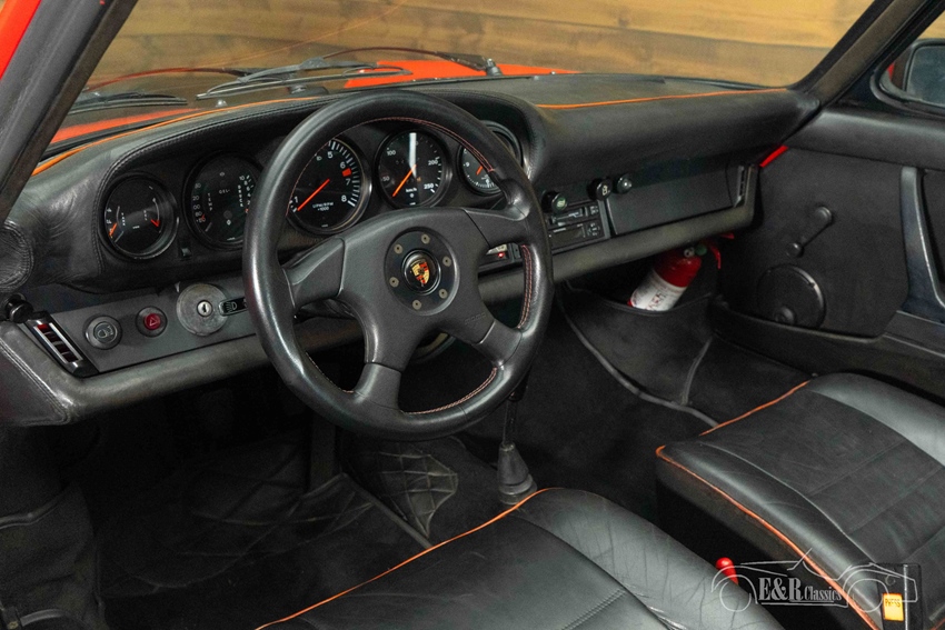Rode Porsche 911 Targa te koop Het exterieur is uitgevoerd in een krachtig rood lakwerk, dat perfect contrasteert met de zwarte Fuchs velgen en de Turbo achterspoiler, wat de auto een sportieve en zelfverzekerde uitstraling geeft. De afneembare targa top zorgt voor het unieke open rijgevoel waar dit model zo bekend om staat. Binnenin vinden we een zwart lederen interieur met rode piping, dat prachtig aansluit bij het exterieur en een uitgesproken sportieve sfeer creëert. Het geheel wordt gecompleteerd door een Momo sportstuur, dat niet alleen visueel aanspreekt maar ook zorgt voor directe stuurbeleving. Deze 911 Targa is een stijlvolle en karaktervolle klassieker met een perfecte balans tussen originaliteit en sportieve upgrades.