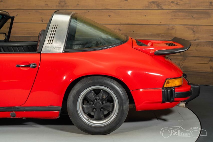 Rode Porsche 911 Targa te koop Het exterieur is uitgevoerd in een krachtig rood lakwerk, dat perfect contrasteert met de zwarte Fuchs velgen en de Turbo achterspoiler, wat de auto een sportieve en zelfverzekerde uitstraling geeft. De afneembare targa top zorgt voor het unieke open rijgevoel waar dit model zo bekend om staat. Binnenin vinden we een zwart lederen interieur met rode piping, dat prachtig aansluit bij het exterieur en een uitgesproken sportieve sfeer creëert. Het geheel wordt gecompleteerd door een Momo sportstuur, dat niet alleen visueel aanspreekt maar ook zorgt voor directe stuurbeleving. Deze 911 Targa is een stijlvolle en karaktervolle klassieker met een perfecte balans tussen originaliteit en sportieve upgrades.