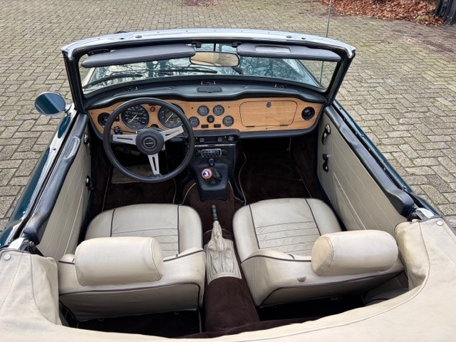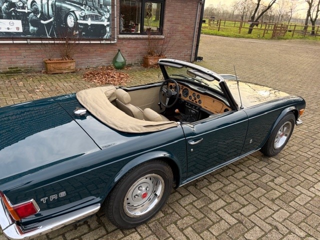Wat een straight 6, een snelle, fast road getunede motor met een fast road nokkenas, gebalanceerde krukas en gebalanceerd vliegwiel, gesmede zuigers, drie Italiaanse Weber-carburateurs (dus geen Spaanse kopieën), een volledig gereviseerde overdrive-versnellingsbak en een gereviseerd differentieel. Zo'n gerestaureerde auto heb je nog nooit gezien! Wat een ongelooflijk mooie vroege Triumph TR6 uit 1973 hebben we hier. Een schitterende verschijning in deze machtige en zeldzame kleur Mallard Green. Wat een onberispelijke kleur, groen, blauw? Het hangt ervan af vanuit welke hoek het zonlicht erop valt. Deze TR6 met matching numbers (inclusief Heritage Certificate) is volledig gerestaureerd en verkeert in uitstekende staat. De auto is opgebouwd en gespoten door topspecialisten en was eigendom van en gebouwd door een man die meerdere autorestauratiebedrijven bezat. Alleen het beste is gebruikt. Er is absoluut geen gram plamuur te vinden op deze auto, het is puur kaal plaatwerk met meerdere lagen sublieme lak. De auto wordt perfect onderhouden door een Nederlands bedrijf gespecialiseerd in klassieke auto's. De techniek van deze TR6 verkeert in uitstekende staat. De motor brult zoals een zescilinder hoort te klinken en de overdrive-versnellingsbak schakelt vlijmscherp, beter dan nieuw. Een aluminium Triumph Tune-kleppendeksel maakt het geheel nog sportiever. De dubbele roestvrijstalen uitlaat zorgt voor het juiste, prachtige geluid. De auto heeft net een onderhoudsbeurt gehad en is dus klaar om te rijden. Het chassis is perfect gerestaureerd, keihard en solide, gespoten in standaard zwart. Als je onder de auto kijkt, is het net zo nieuw als van boven. Het plaatwerk is ongelooflijk strak en het lakwerk is uitstekend. De Triumph heeft 5 originele stalen wielen met chromen velgen. Het interieur is subliem, de stoelen zijn bekleed met beige leer met groene piping. De vloerbedekking is nieuw en afgewerkt in chocoladebruin. De trimpanelen zijn origineel uitgevoerd in bijpassend beige leer. De softtop is gemaakt van bruin mohair, wederom alleen het beste. De kaphoes is gemaakt van hetzelfde beige leer als de stoelen, fantastisch. Het chroomwerk rondom is in uitstekende staat, als nieuw. Een prachtig origineel stuurwiel en het houten dashboard maken de klassieke sportieve look van deze zescilinder compleet. De auto heeft een geldig Nederlands kenteken. Voor buitenlandse kopers zijn de juiste exportdocumenten op uw naam bij onze prijs inbegrepen, zodat de registratie in het buitenland eenvoudig is. Levering is ook mogelijk tegen een kleine meerprijs. Kom luisteren naar het geluid van deze zescilinder met drie Weber-carburateurs, geef gas en u zult overtuigd zijn. Wat een machine!