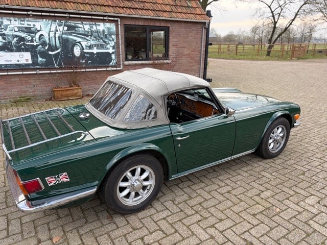 Full restored Triumph TR6 from 1976. This TR6 is equipped in British Racing Green. The previous owner put an incredible amount of money and effort into it and it shows. The restoration must have cost many times more than the price now . What a beautiful, super sleek panel and paint job, incredible. Under the car and in the wheel arches you can see how beautifully the car is done.! Everything has been taken care of in the best way. Chassis, engine, gearbox. The technology is in perfect order, the engine and gearbox are like new. Touching the key is enough to make the wonderful 6 cylinder roar! The car is equipped with a HS6 conversion with K&N filters for more power and a Kenlowe cooling fan. The interior is in great condition as the photos show. Superb sort seats with great lateral support, neat interior panels, a proper carpet set, a superb wooden dashboard with rebuild gauges,new electricity, new brakes all around with an upgraded brake servo for excellent stopping powers The quality doesn't lie. The soft top is a canvas one.