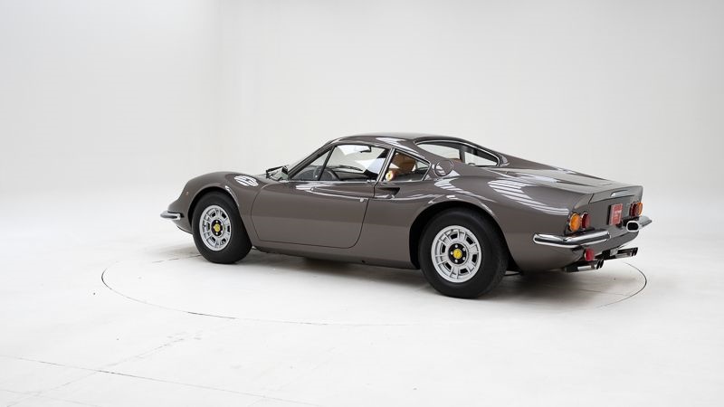 Het tijdloze koetswerk van Pininfarina wordt algemeen beschouwd als één van de mooiste sportwagenontwerpen aller tijden. De vloeiende lijnen, compacte proporties en perfecte visuele spanning maken de Dino 246 GT tot een designicoon dat losstaat van trends of tijdperken. In deze specifieke uitvoering wordt dat karakter nog versterkt door de uiterst zeldzame Marrone Dino Metallizzato-kleur, waarvan slechts een zeer beperkt aantal exemplaren werd geproduceerd.