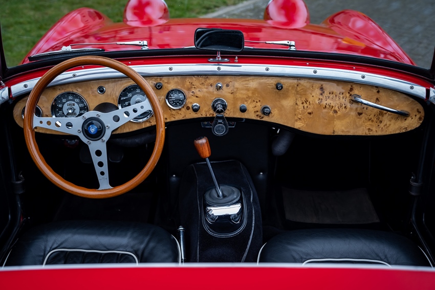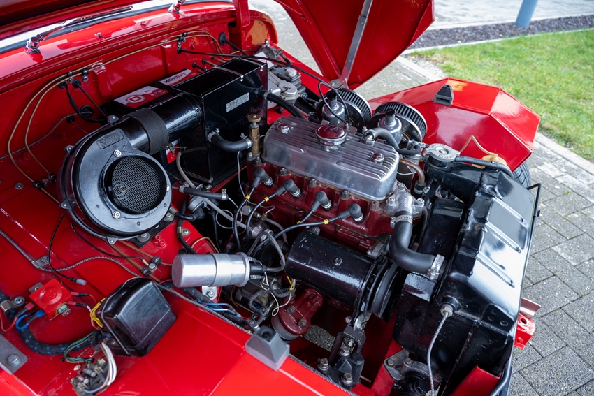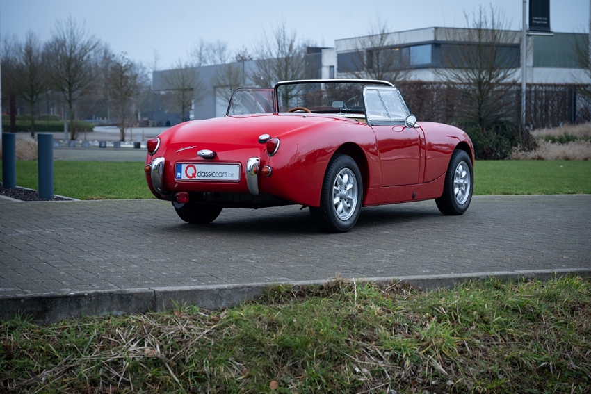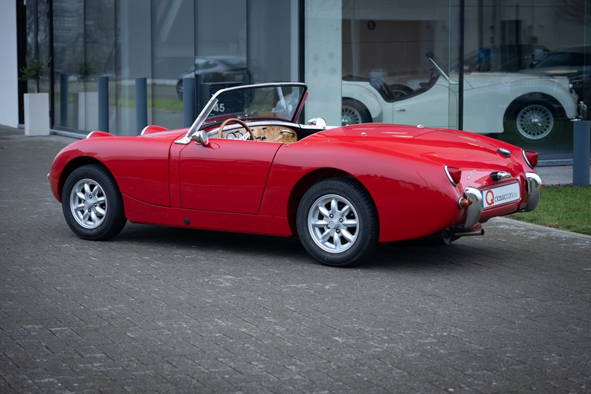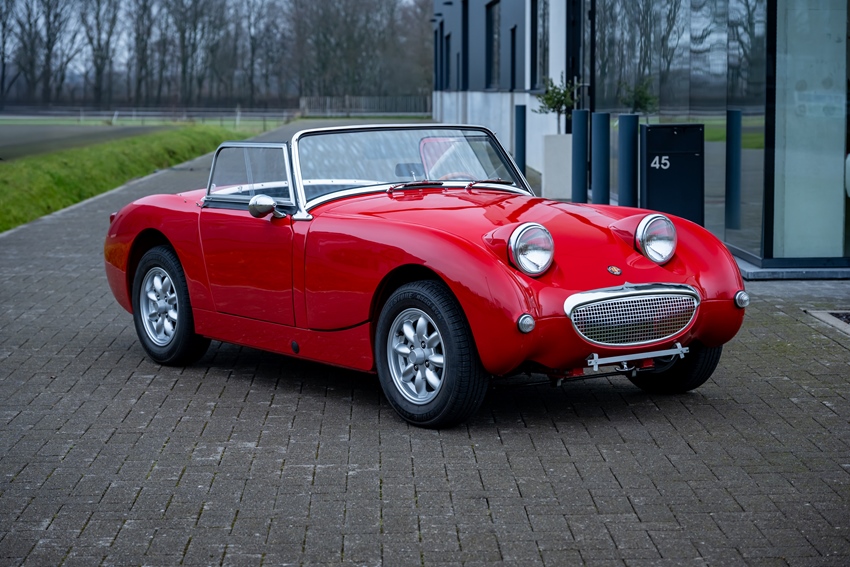 Charmant, licht en onweerstaanbaar iconisch. Deze Austin-Healey Sprite “Frogeye” is uitgevoerd in helderrood met een mooi zwart lederen interieur—klassiek Brits in zijn puurste vorm. Voorzien van een zwarte softtop, zijramen en tonneau cover. Een heel leuke, compacte cabrio met verrassend grote koffer. De auto verkeert in prachtstaat.