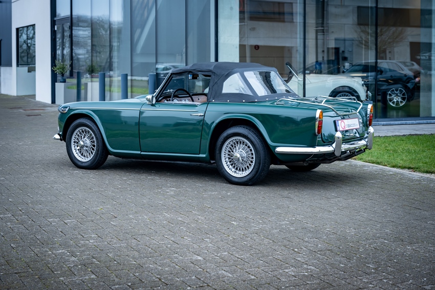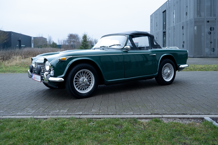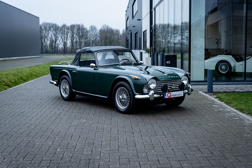Stijlvol, puur en klaar voor plezier. Deze Triumph TR4A IRS in klassieke groene kleur met spaakwielen is in het verleden zeer mooi gerestaureerd en staat nog steeds strak met mooie passingen.