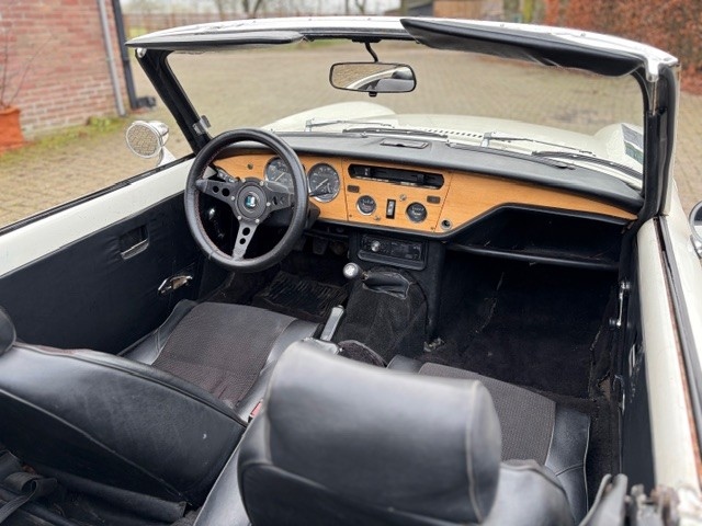 This Spitfire is a great drivers car, it has a neat appearance, a beautiful 70's classic. It's build up a bit more sporty than standard , it has a hardtop which gives the car a sort of a coupe look. Together with the wide , black revolution wheels it's a sporty classic. The paintwork is very neat, the white looks particularly fresh and sporty, especially in combination with the black upholstery, black wheels, black hardtop and black vinyl soft top. Take of the hardtop and you drive a classic convertible , the softtop is still there just in case it might rain. The paint has a few minor imperfections but nothing major. The car is a particularly nice and rustfree appearance. The interior is neat, the seats are nice and proper and got good foams fitted , the door panels and carpetset are all equipped in the same matching black. This Spitfire has a nice wooden dashboard and a leather sports steering wheel. It is just as fresh under the bonnet and well maintained. The technology is in excellent order. The engine and gearbox are in very good condition. The car just had its yearly maintenance and we fitted a new exhaust silencer. The chassis is very solid and rust-free. The car now has French papers but is a former Dutch licensed car, so real easy to get the original Dutch licence back. Who wants a sporty UK classics for low money?