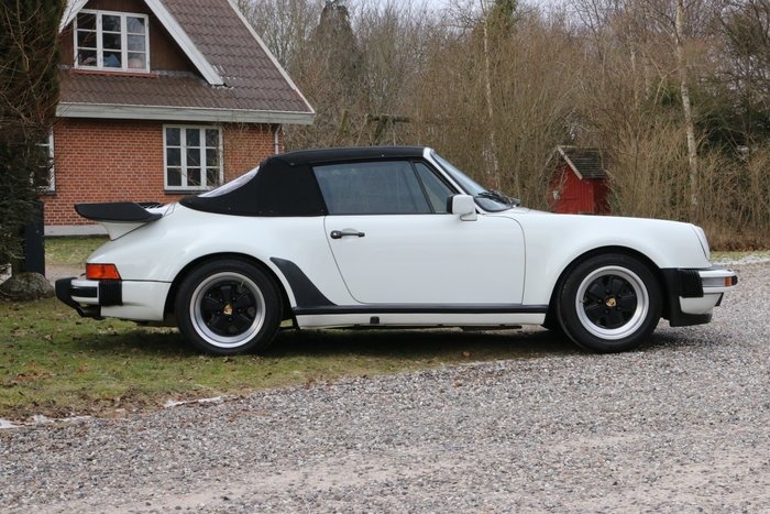 Bekijk deze iconische Porsche 911, bekend als de widow maker vanwege de turbo-boost. Deze auto is oorspronkelijk nieuw geleverd aan de VS en in 2009 naar Europa geïmporteerd; daar is hij eigendom geweest van een Duitser tot 2018, waarna hij deel uitmaakte van een privé Deense collectie. De lak is over het algemeen in goede staat, maar let op het rechter achterspatbord (zie foto's), waarop een scheur in de lak zit. Als je de lak opmeet lijkt het erop dat zowel het voor- als achterspatbord aan de rechterkant ooit tegelijk opnieuw zijn gespoten. Verder ziet de lak er goed uit, met enkele deuken en slechts een paar heel kleine steenslagplekjes aan de voorkant. - Voorruit heeft ook geen schade die groter is dan een steenslag, maar er zitten wel een paar kleine beschadigingen. Binnenin is alles zonder krassen (ook geen barsten in het dashboard). De zwarte lederen stoelen zien er nog goed uit en voelen zacht aan met normale gebruikssporen na gebruik, maar geen slijtage aan de zijkant van de stoelen waar je in- en uitstapt. De softtop heeft alleen normale marks wanneer hij gevouwen wordt. Het cabriodak werkt elektrisch en gaat zonder problemen omhoog en omlaag; druk gewoon op de knop op het dashboard. Het airconditioningssysteem gebruikt het oude type koelmiddel, wat in Denemarken niet langer is toegestaan om bij te vullen, dus kunnen we niet garanderen dat het werkt. Het elektrische raam in de bestuurdersdeur werkt alleen voor het linkerraam; het rechterraam kan bediend worden vanaf de schakelaar in de rechterdeur. Als je van plan bent de auto regelmatig te gebruiken, raden we je aan eerst een onderhoudsbeurt te laten uitvoeren voordat je ermee aan de slag gaat, omdat er destijds toen hij in de collectie zat niet zo vaak onderhoud is uitgevoerd. De banden zijn Continental en hebben ongeveer 50% loopvlakslijtage, maar dateren uit 2015. Helaas is er geen serviceboekje bij de auto, maar de documentatie die bij de auto hoort, zoals de factuur en het Autocheck-rapport, geloven wij dat de kilometerstand klopt. In 2016 is er een Duits Fahrzeugwertgutachten opgesteld, dat de kilometerstand op dat moment op 40.882 km documenteert, en met de beoordeling 2+ wat betreft de algehele toestand.