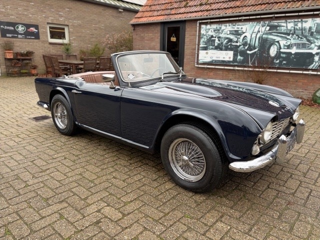 Zeer nette Triumph TR4 uit 1964 in Royal Blue. De auto is 37 jaar in het bezit geweest van de vorige eigenaar. Deze man heeft de Triumph geheel gerestaureerd,Het chassis en de ophanging zijn eerst gedaan, tegelijkertijd zijn de motor en versnellingsbak volledig gereviseerd. Daarna is de hele carrosserie onder handen genomen. De auto heeft superstrak plaatwerk met prachtige glanzende lak. De auto is volledig gedaan door een Nederlandse klassiekerliefhebber, hij heeft alles als fabrieksorigineel gemaakt. De man heeft uitstekend werk geleverd, het chassis is volledig gereviseerd en het plaatwerk is ongelooflijk strak en prachtig en professioneel gespoten. Het chroomwerk rondom de auto is nog steeds als nieuw. Onder de motorkap is het net als de buitenkant, alles ziet er super fris uit. De carburateurs zijn de alom bekende en veel gebruikte Strombergs. Een verchroomd kleppendeksel maakt het extra klassiek. Het interieur is allemaal uitgevoerd in Tan, een prachtigste combinatie met de donkerblauwe lakkleur. Er is een prachtige matching chocolade bruine tapijtset gemonteerd en het dashboard is uitgevoerd in hout, af fabriek standaard op TR4's uit deze jaren. De meters zijn destijds gereviseerd en werken perfect. De TR staat op bijzondere chromen bolt on wire wheels, een optie uit USA in de jaren 60 en 70. Het stuurwiel is het originele zoals af fabriek gemonteerd, een perfecte match met het houten dashboard.De softtop is nieuw en gemaakt van zwart vinyl. Er is een zwarte vinyl tonneacover beschikbaar om de cockpit af te sluiten.Eventuele exportpapieren zijn altijd inbegrepen in onze prijs. Wij kunnen transport voor u regelen voor een eerlijke prijs.