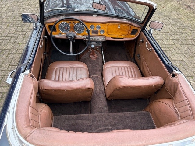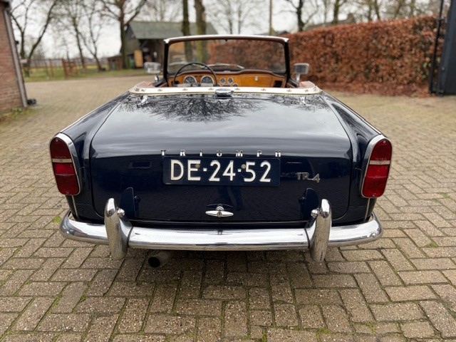 A very neat 1964 Triumph TR4 in Royal Blue. The car was owned by the previous owner for 37 years. This man completely restored the Triumph. The chassis and suspension were done first, while the engine and gearbox were completely overhauled at the same time. After that, the entire bodywork was taken care of. The car has incredibly straight bodywork with a beautiful gloss paint. The car was completely restored by a Dutch classic car enthusiast, who made everything factory-original. He did an excellent job; the chassis was completely overhauled, and the bodywork is incredibly straight and beautifully and professionally painted. The chrome around the car is still like new. Under the bonnet, it's just like the exterior; everything looks super fresh. The carburetors are the well-known and frequently used Strombergs. A chrome-plated valve cover adds a touch of classic style. The interior is all finished in tan, a stunning combination with the dark blue paint. A beautiful matching chocolate brown carpet set has been installed, and the dashboard is made of wood, a standard factory fitment on TR4s from this period. The gauges were reconditioned and work perfectly. The TR stands on unique chrome bolt-on wire wheels, a US option in the 1960s and 1970s. The steering wheel is the original factory-fitted one, a perfect match with the wooden dashboard. The soft top is new and made of black vinyl. A black vinyl tonnea cover is available to close off the cockpit. Any export paperwork is always included in our price. We can arrange transport for you at a fair price.