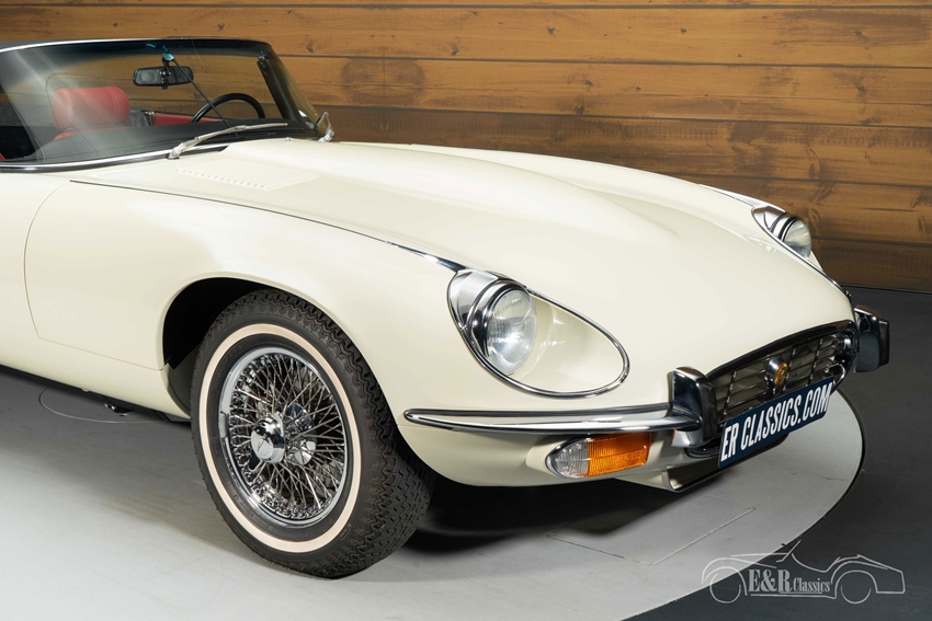 Jaguar E-Type Series 3 Cabriolet met airconditioning te koop Het exterieur is uitgevoerd in stijlvol Old English White lakwerk dat prachtig contrasteert met de zwarte soft top en de klassieke chromen spaakwielen. De elegante lijnen, lange neus en subtiele chroomdetails komen in deze kleurstelling volledig tot hun recht. Het interieur is bekleed met rood leder, dat in combinatie met het lichte lakwerk zorgt voor een tijdloze en sportieve uitstraling. Het dashboard, driespaaks stuurwiel en de rijke klokkenpartij ademen pure jaren ’70 klasse. Voor extra comfort is de auto uitgerust met airconditioning, wat het rijplezier tijdens zomerse toertochten nog verder verhoogt. Deze Jaguar E-Type Series 3 Cabriolet is een unieke verschijning die prestaties, luxe en exclusiviteit perfect samenbrengt.
