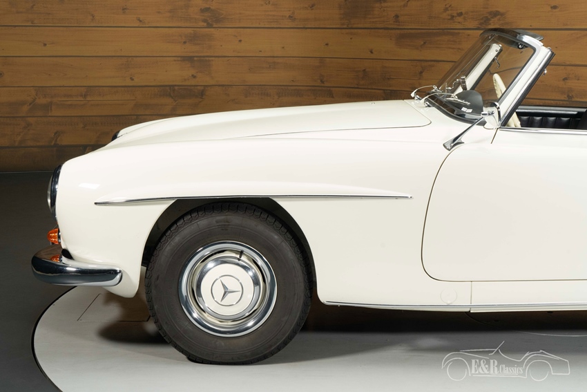Witte Mercedes-Benz 190 SL te koop Het uiterlijk is tijdloos en bijzonder smaakvol uitgevoerd in wit lakwerk, dat prachtig combineert met de heldere chroomdetails, klassieke wieldeksels en de karakteristieke SL-neus. Met de zwarte soft top oogt de 190 SL chic en compleet, terwijl hij open juist die typische ‘sixties’ grand touring-uitstraling krijgt. Binnenin sluit het zwarte lederen interieur naadloos aan op het exterieur en vormt het samen met het lichte stuurwiel en het fraaie dashboard een stijlvol contrast. De details – van de klassieke klokken tot de bedieningselementen – geven precies die authentieke Mercedes-sfeer die je in moderne auto’s mist. Extra leuk is de aanwezige 3e zitplaats, een zeldzaam en charmant detail dat deze 190 SL nóg unieker maakt.